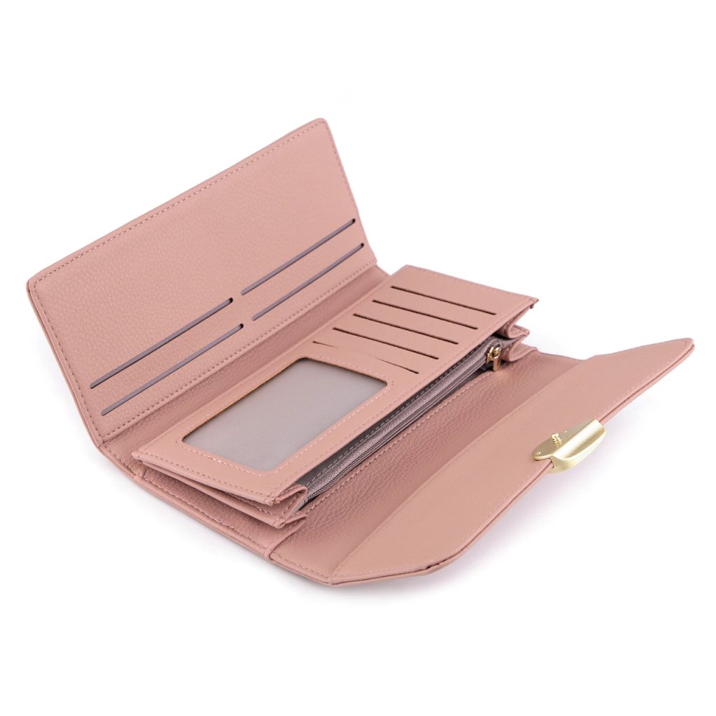 Dámska peňaženka má kvalitný dizajn a praktické usporiadanie. Uzatvára sa klopou a ozdobným patentom. Má 9 priehradiek na karty, z ktorých jedna je priehľadná. Veľké ploché vrecko a 2 vrecká na bankovky. Vrecko na mince má zapínanie na zips. Rozmery: 9,5 x 19 x 3,5 cm.Dodatočné parametre